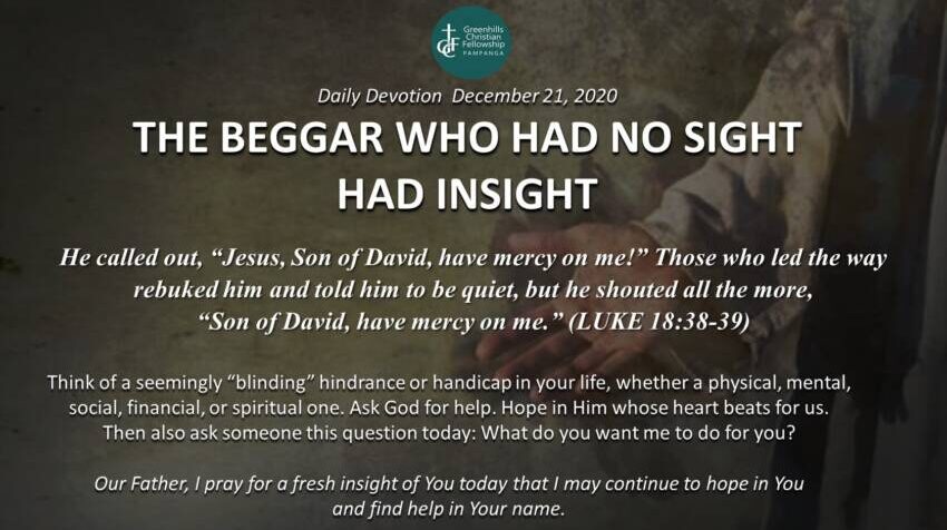 He showed insight and faith when he claimed that Jesus could show mercy on him, when he was not deterred by the crowd’s rebuke, when he expressed his desire to be healed, and when he decided to follow Jesus right after the restoration of his sight. The eyes of Bartimaeus were faulty but his eyes of faith saw how Jesus could change his life. That’s insight only God can give.